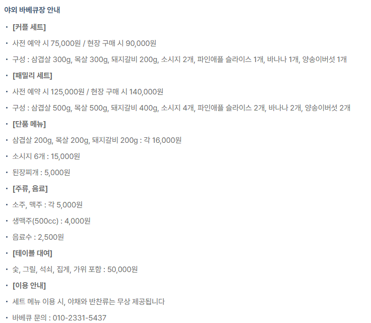 야외바베큐는 미리예약하면 커플이 7만5천원이였어요. 현장 구매하면 9만원....