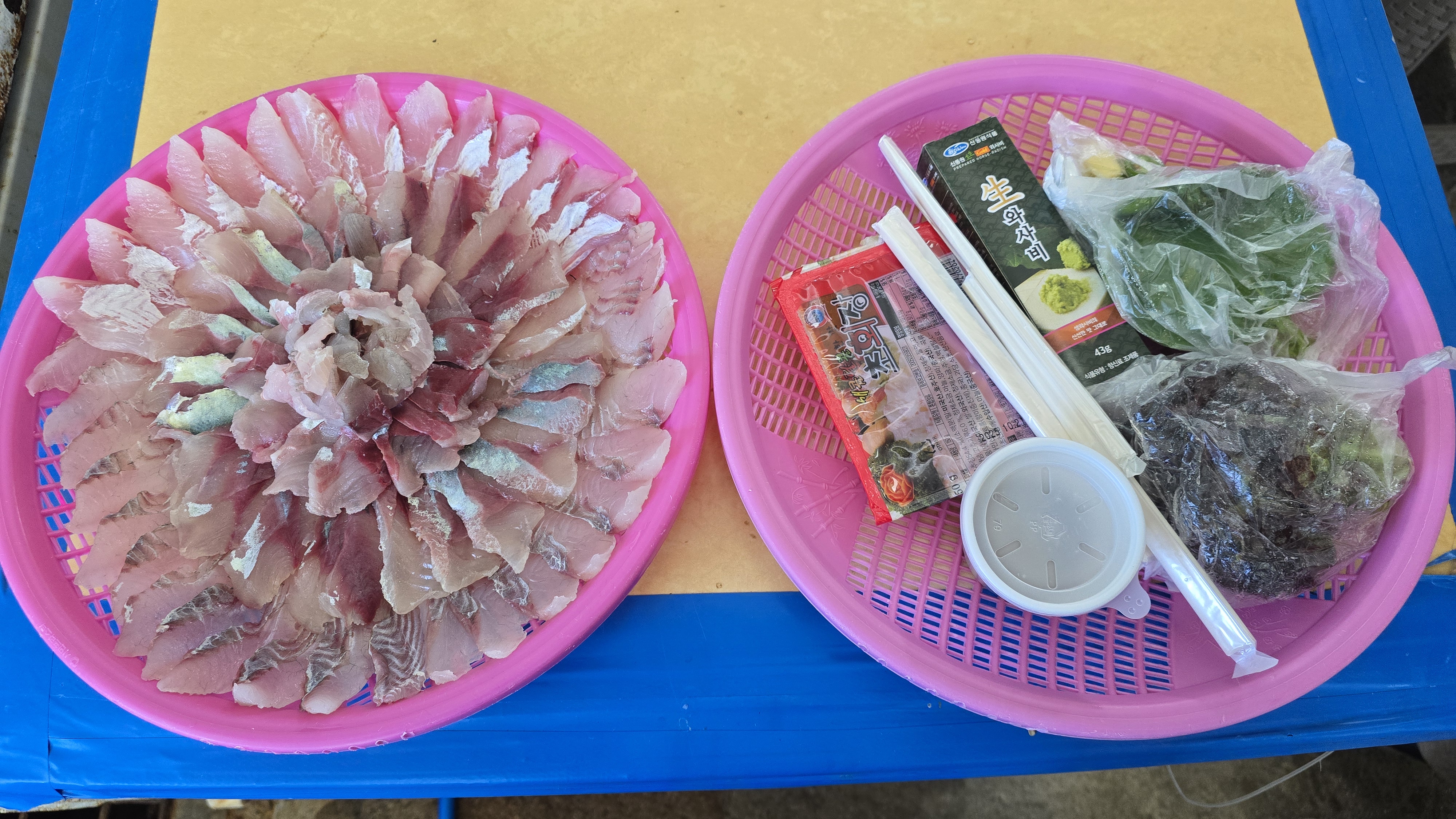 자연산 광어를 포함해 얻은 물고기들을 들고 동명항에 가서 1만원에 회를 뜨다.