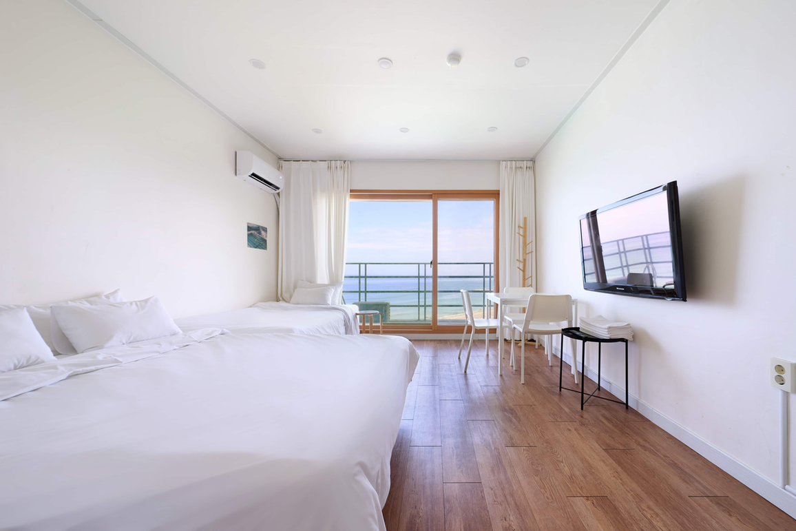 그 점을 빼고는 3인 기준 / 싱글침대 1 더블침대 1개 / 취사가능/ 바다인접 / 청결/ 오션뷰 / 베란다 등