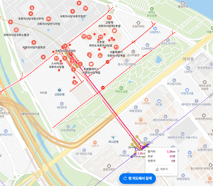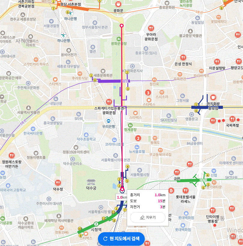 그리고 박근혜 전대통령 탄핵 때 사람들이 모여서 채워진 거리를 재어보았다.