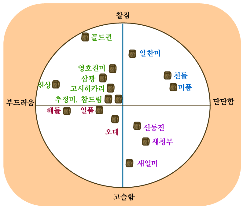 이 그림 자료는 인터넷에서 떠도는 자료들과 후기 등을 참고하여 만들었는데 쌀 품종들 마다 약간 다르게 평가하고 있는 곳도 있었다. 예를 들어 신동진을 부드럽다고 평가하거나 참드림을 단단함 쪽에 포함시키는 표가 존재한다. 그래서 후기를 검토해 보고 제일 가까운 듯한 것을 기준으로 다시 그려 넣어 보았다. 그럼에도 불구하고 이 기준이 절대적 기준이라고 볼 수는 없을 것이다.