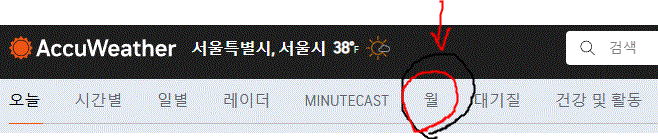 AccuWeather에서는 그날 그날의 일기예보 확인도 가능하지만 메뉴 바에서 월을 누르면 다음 아래 같은 화면이 나오고 한달 전체의 일기예보를 확인 할 수 있다.