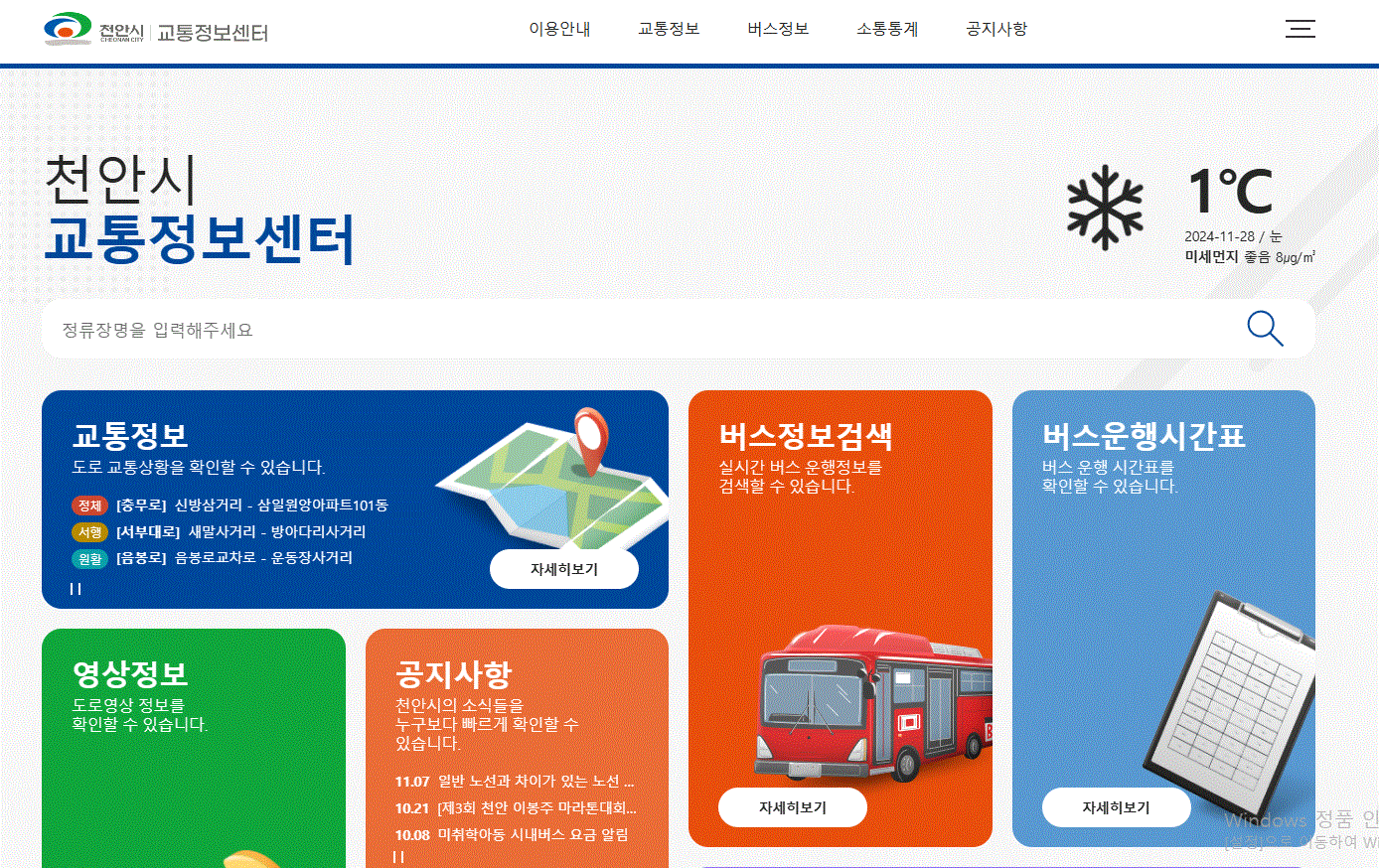 위와 같이 각 지역 교통정보 센터에 들어가면 실시간 교통정보뿐 아니라 그 지역 버스 노선 정보 등 그 지역 관련한 다양한 정보를 접할 수 있어서 좋다. 이것은 청주시교통센터뿐 아니라 각 지역 교통정보 센터들에게 고통적으로 적용되는 부분이다.