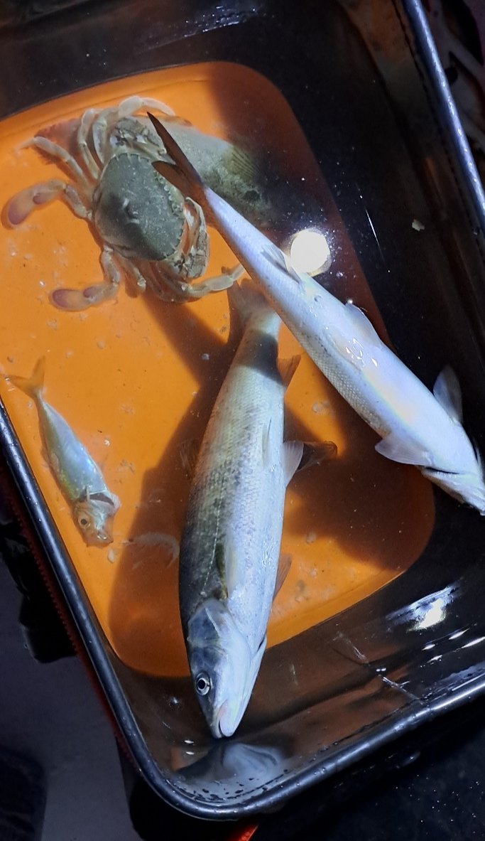 둘째 날 : 황어 2마리, 우리가 잡은 게 한마리, 전갱이 1마리, 이름 모를 물고기 1마리