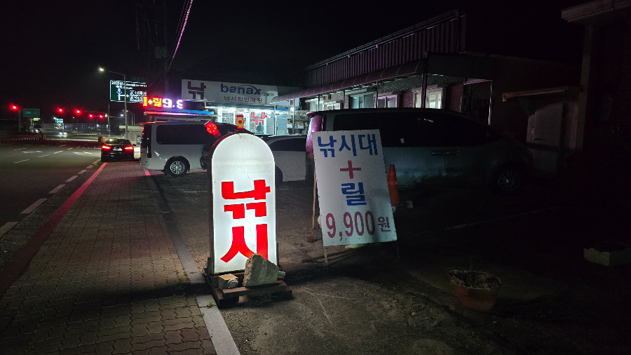 차로 이동하는데 낚싯대+릴 9900원이라고 써져 있는 광고판이 그 밤에 환하게 세워져 있었다. 바로 차를 세우고 들어갔는데 생미끼는 팔지 않고 낚시용품만 있다고 하셨다.