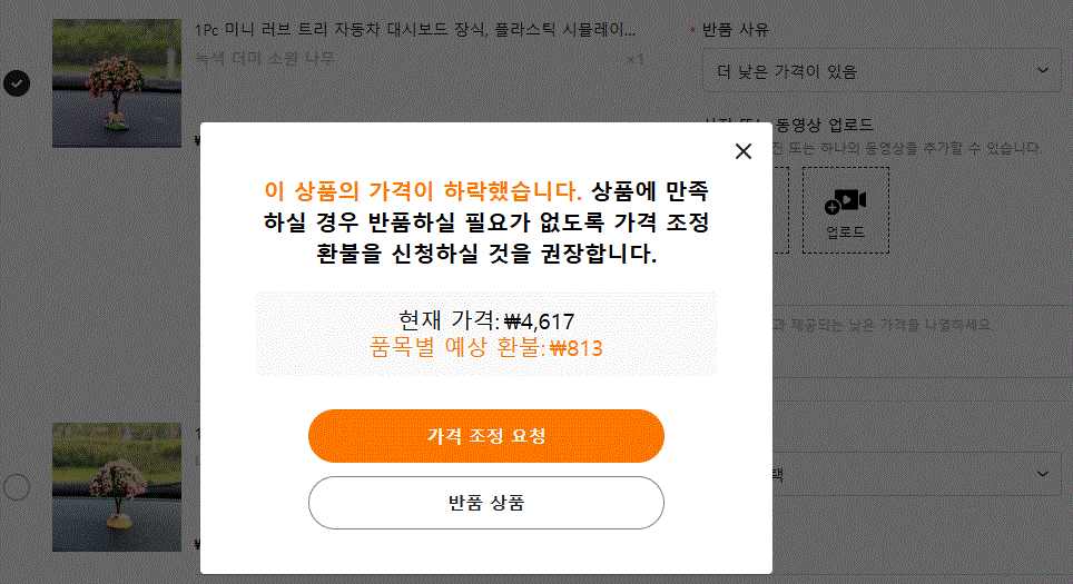 다음 반품 사유를 묻는다. 더 낮은 가격이 있음을 선택하면 가격조정/ 환불 / 교환 이란 메세지가 떴다.