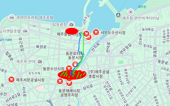 위의 작은 붉은 동그라미가 휘슬락호텔 위치이고   아래 큰 붉은 동그라미가 동문시장이다. 10~15분 거리... 걷는 길의 풍경 괜찮아서 구경하며 걸을만 하다.