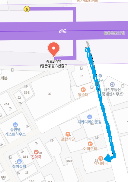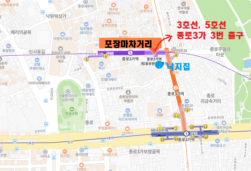 포장마차 거리는 종로 3가 3번출구로 나오면 보인다. 그리고 포장마차 거리 입구쪽 골목으로 내려 가면 낙지집이 있다.