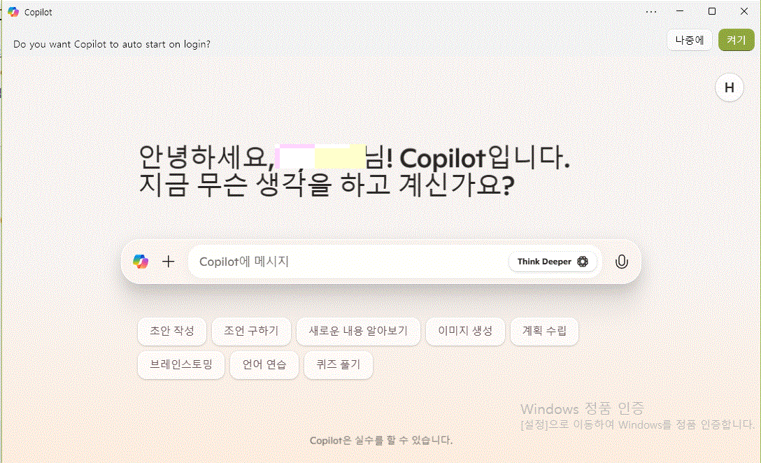 언제부터인가 컴퓨터 화면 하단 도구모음 틀에 무개색 아이콘이 하나가 생겼다. 내가 무슨 조작을 한 것인지 기억도 안 나는데 뭔가 싶어 눌러봤더니 코파일롯이라는 ai 창이 떴다.